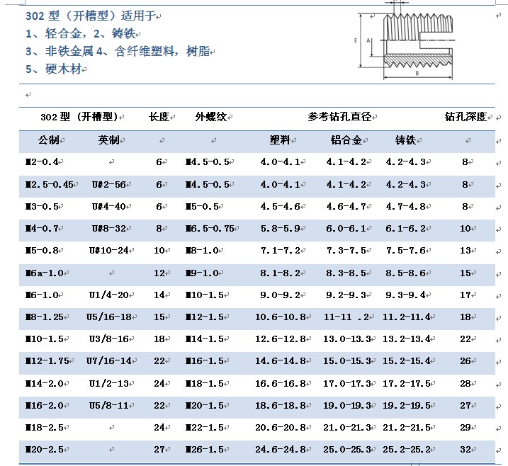 (1)开槽型,又名302型,螺套头部开有一个切削槽,实现自攻特性;